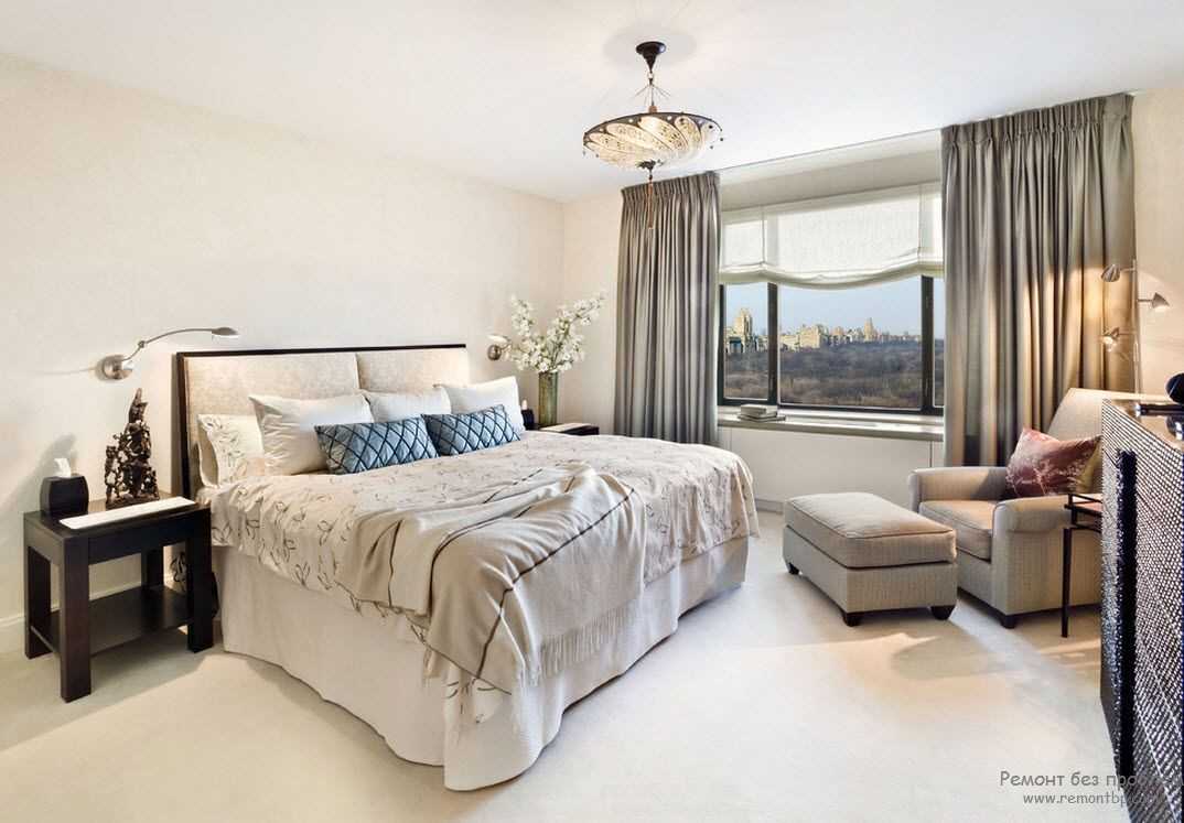 Когда основные конструктивные элементы в спальной комнате установлены, время подумать о ее внешнем оформлении. Обязательно заранее выбирают цветовую гамму глухой комнаты, чтобы после отталкиваться от нее. Преимуществом обладают светлые оттенки нейтральной гаммы в силу возможности визуально расширять пространство.