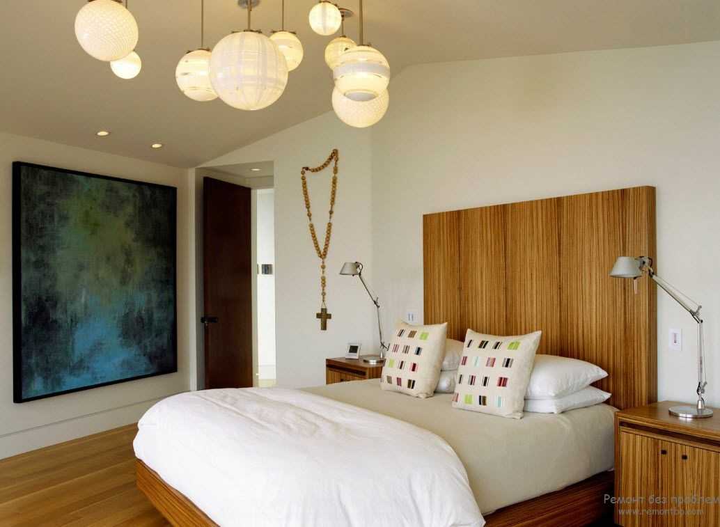 Так, большой светильник в маленькой спальне визуально уменьшит ее. Светильники с направленным вверх потоком света помогут сделать потолок «выше».