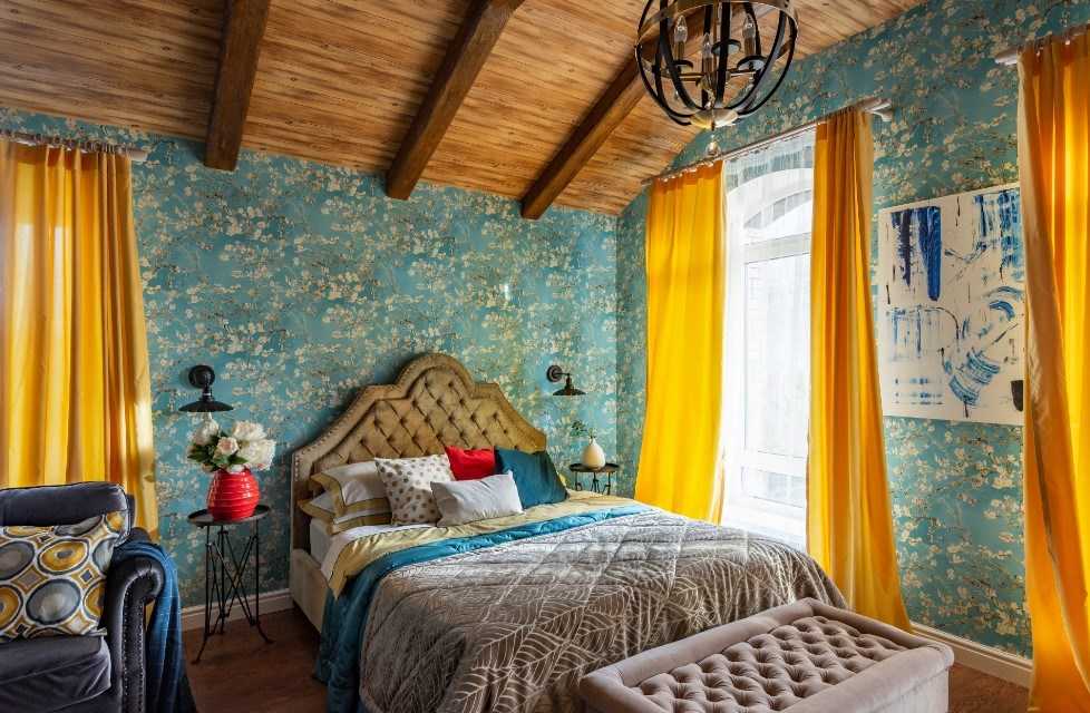Цвет покрывала можно сочетать с расцветкой обоев. Оформляя помещение обоями с принтом, можно сделать рисунок основным фоном для текстиля. Таким образом можно получить гармоничный и оригинальный интерьер.