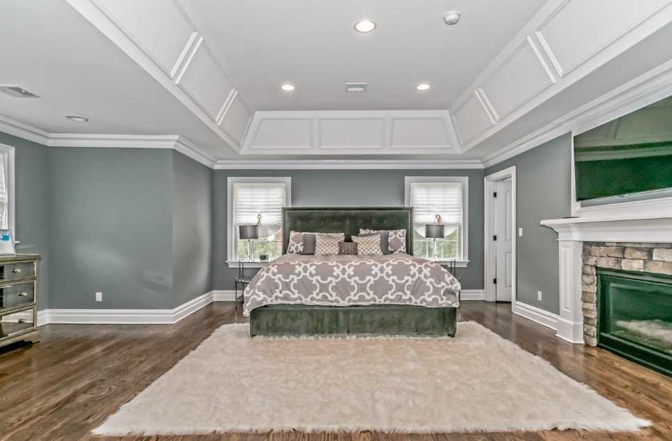 Для более необычного оформления сделайте отделку потолка с такого материала, как и пола. Если говорить о стенах, то выбирайте обои одного цвета. Имея большую спальню, по желанию сделайте фото принт на всю стену.