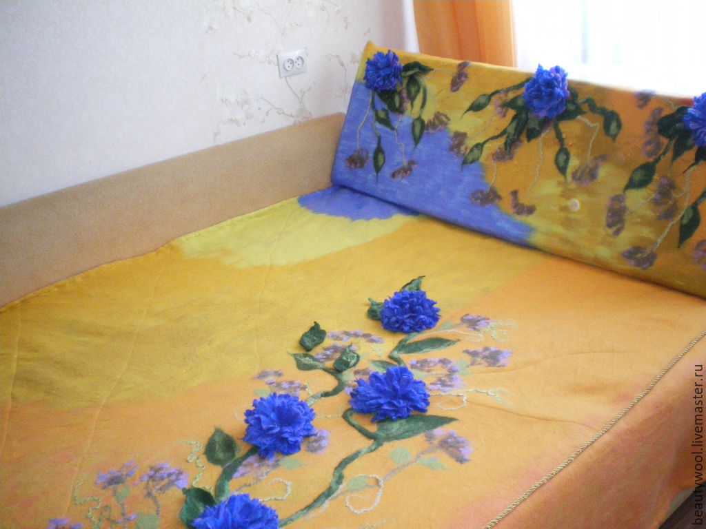 - Валяные покрывала часто используются как плед односпальный. Они очень теплые и легкие. Для создания таких изделий требуется много времени и навыки валяния. Из разноцветных шерстяных волокон получают затейливые рисунки, имитирующие роспись акварелью. Стоимость готовых изделий высокая.