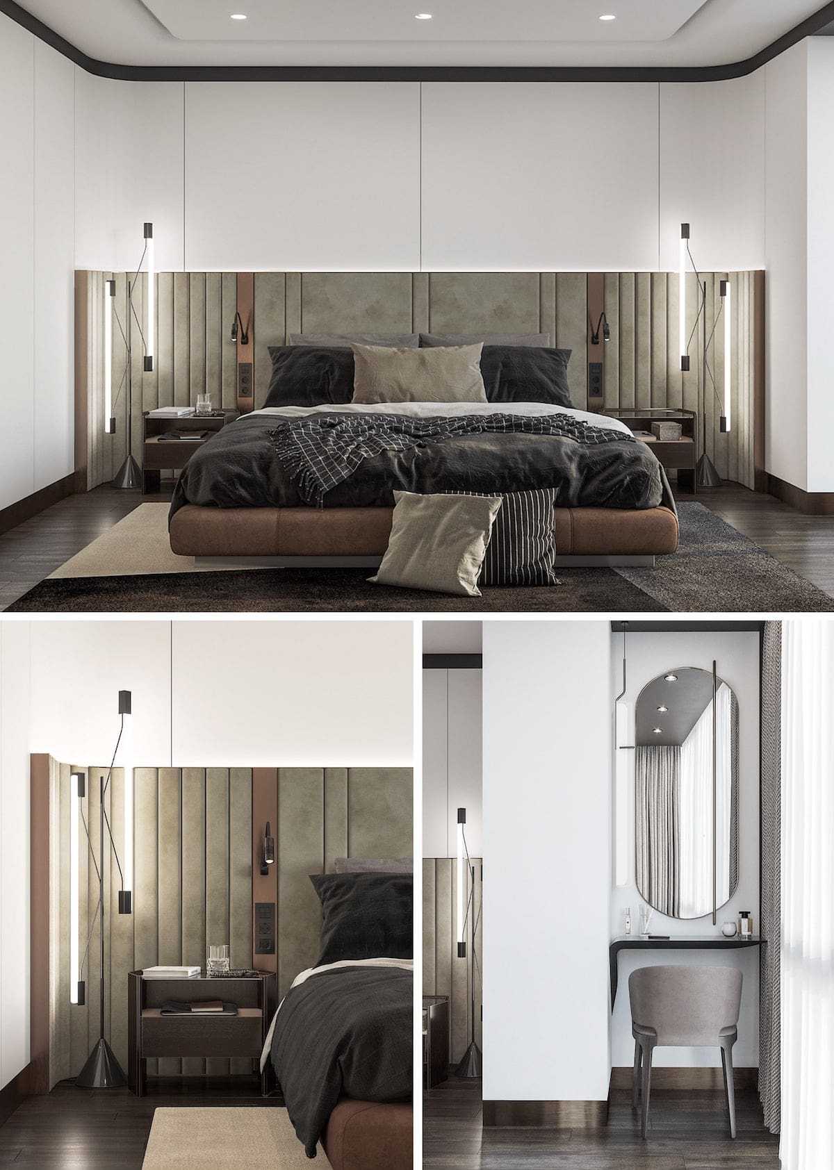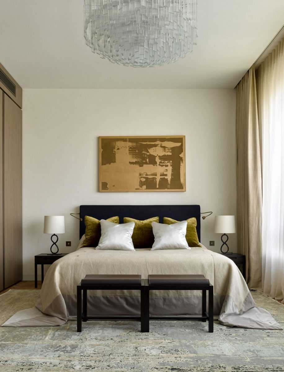 Стильная спальня со светильниками золотого цвета на стеклянных прикроватных тумбочках