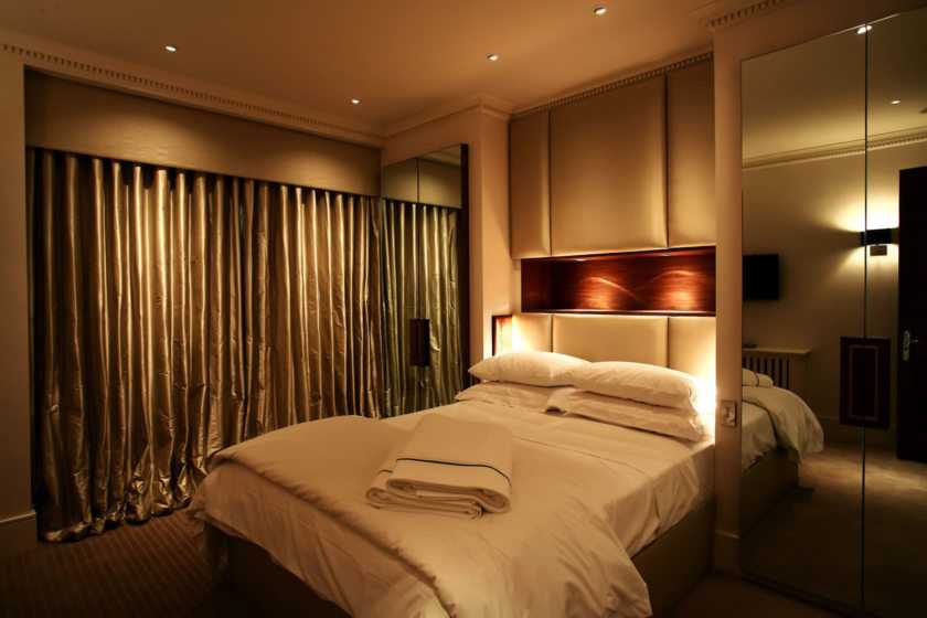 В небольших спальнях устанавливают светоотражающие элементы, а также большое количество настенных светильников.