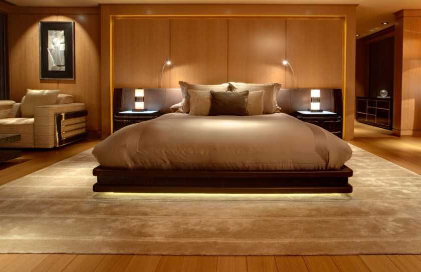 Обратите внимание! Следует использовать такие источники освещения, которые обеспечивают свет в естественном спектре. Единственный недостаток — это необходимость заранее продумывать месторасположение прибора в спальне, а на стадии ремонта проводить проводку для него