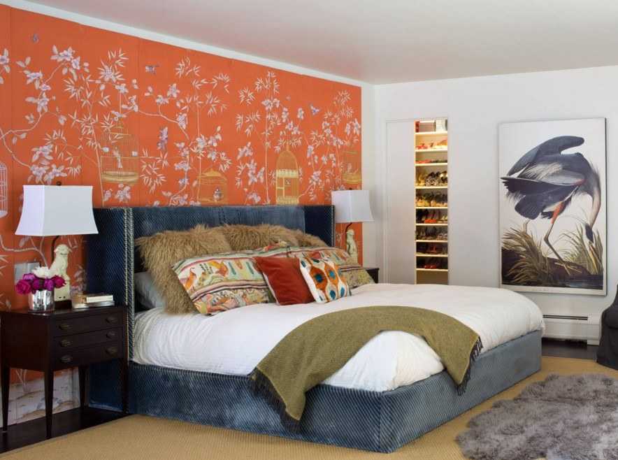 Стена в спальне над кроватью может быть проявлением творчества и фантазий, она оформляется плиткой, обшивается деревом, текстилем, картиной, фальш-окном, рамками, фотопанелями.