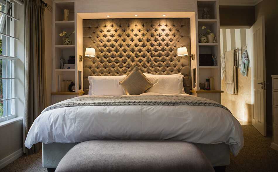 Идеальное решение для угловой комнаты или при выборе кровати без спинки. Стена может быть отделана разной формой обивки, кожзаменителем или тканью (замша, велюр, шелк).