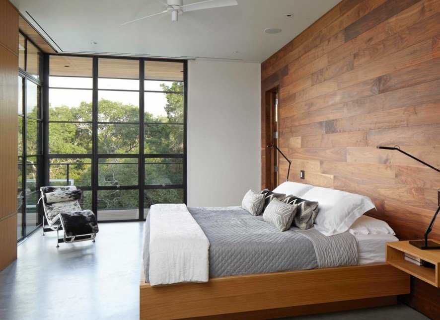 Данный вариант подойдет для создания эко-стиля. Стена выполняется из досок, деревянных панелей, легко крепится, не требует выравнивания, прячет провода и проста в уходе. Лучше всего смотрится у изголовья кровати в дополнении с настенными скульптурами или картинами.