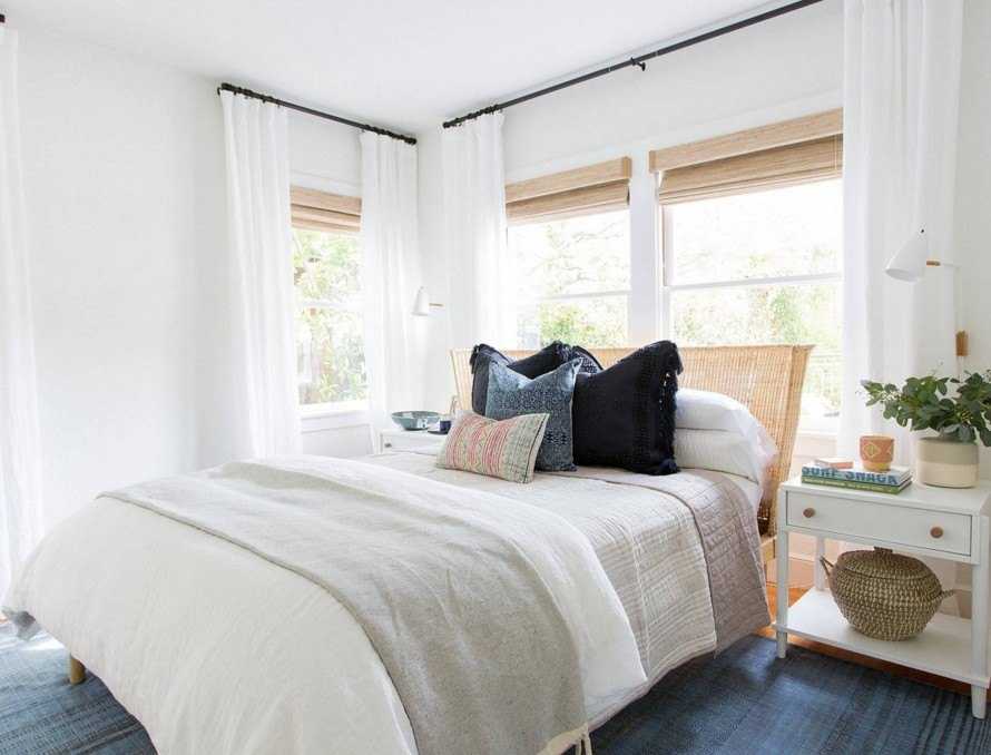 Постельное белье должно вписываться в общую композицию: стоит подобрать комплект в спокойных, природных оттенках или с мелким цветочным принтом.