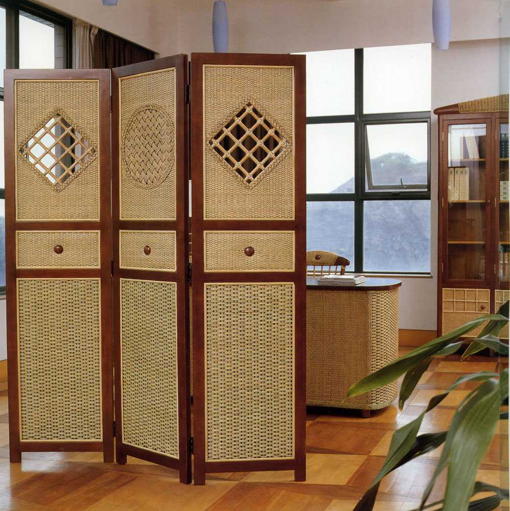 - Ширмы этнического стиля. Для них используют природные экологичные материалы. Перегородку из ротанга можно установить вместо шторы возле окна или загородить супружескую или детскую кровать. Практичный и прочный вариант перегородки –бамбуковая ширма, которую обтягивают декоративным материалом из грубого волокна и фиксируют веревочными петельками.
