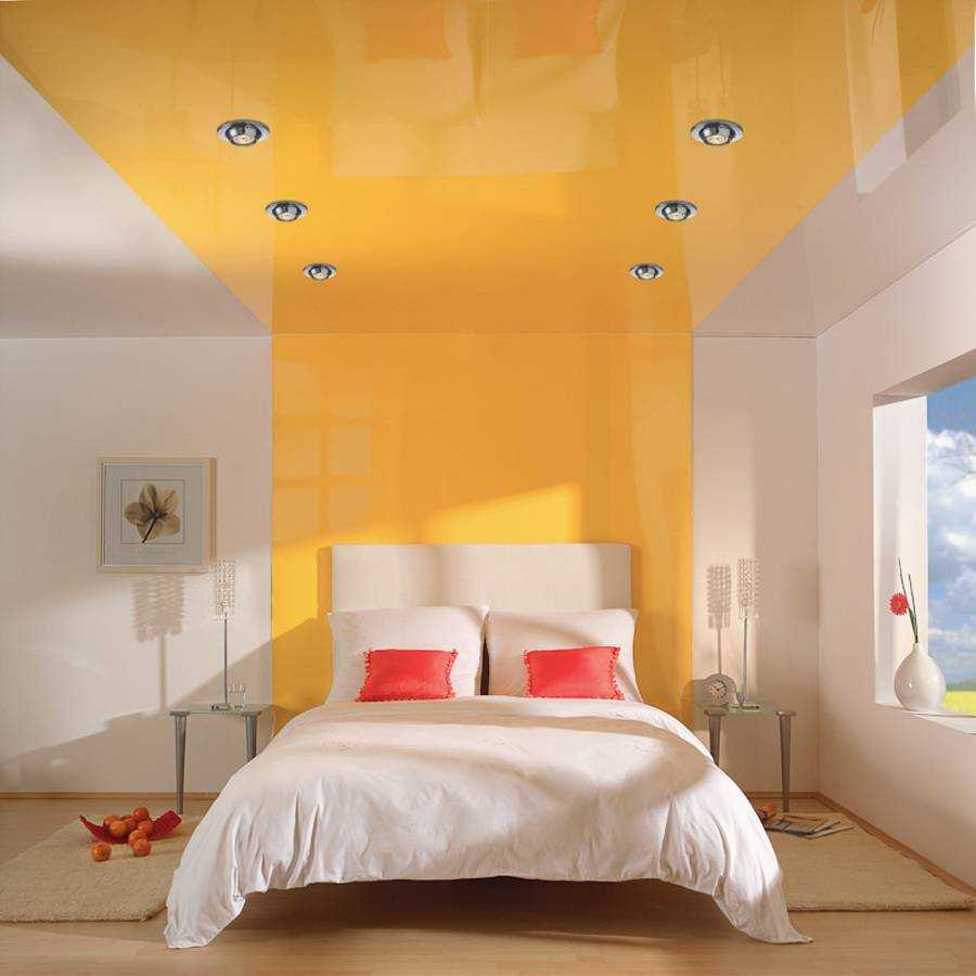 Если конструкция натяжных потолков в вашей спальне является многоярусной, то цвет основного покрытия можно выбрать желтым, а для его разбавки использовать белые или песочные вставки.