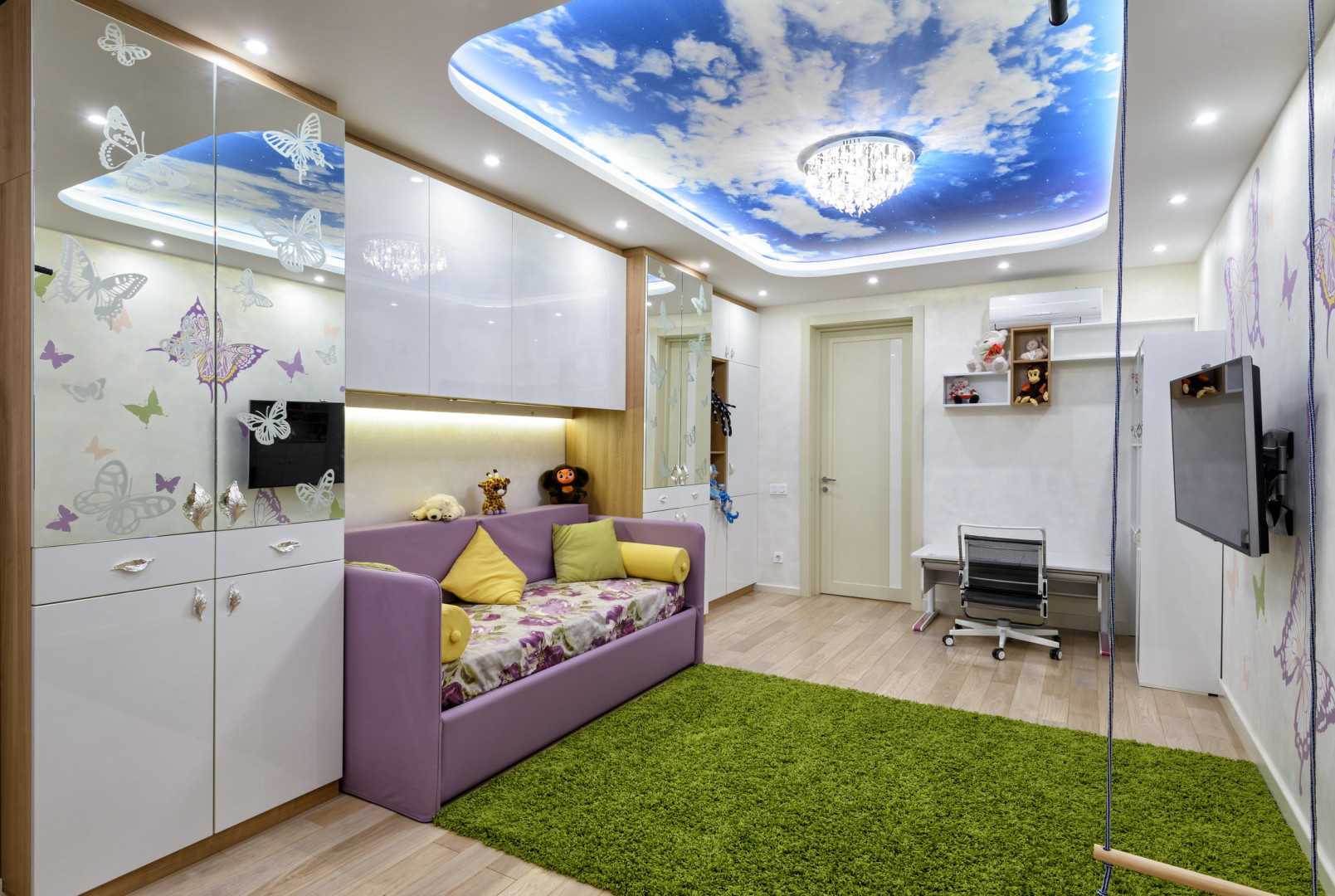 Белый цвет — универсален для потолка. При желании можно использовать в детской любые спокойные оттенки: молочный, кремовый, абрикосовый, светло-васильковый, нежно-розовый. Яркие рисунки визуально сделают потолки ниже.