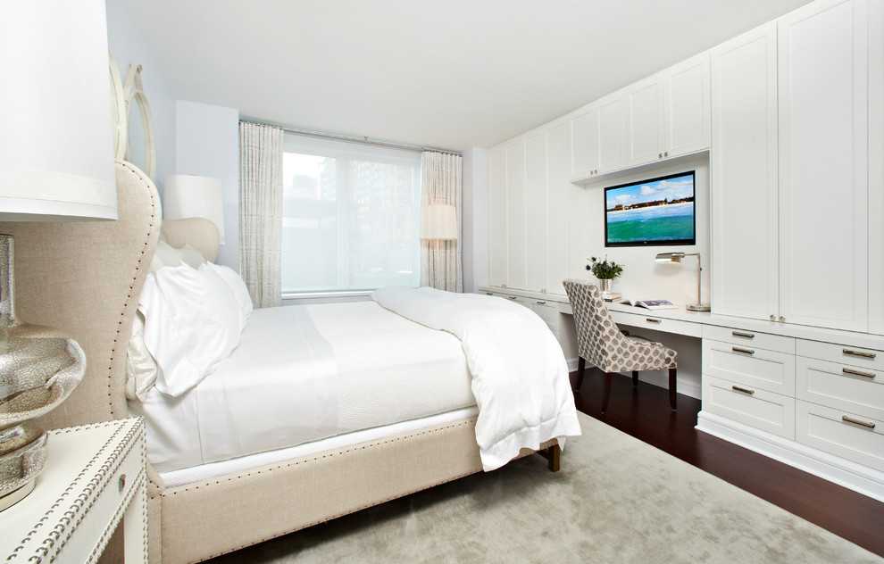 Шкаф. Шкаф должен быть не сильно глубоким, дабы не занимать полезную площадь, в высоту он должен быть до самого потолка, а ширина определяется уже исходя из места, куда его можно установить. Чаще всего шкаф целиком занимает одну из стен. Выгодно смотрится шкаф на всю стену, внутри которого предусмотрена ниша для кровати. Здесь и прикроватные тумбочки готовы и освещение изголовья и каждой стороны кровати и площадь спальни расходуется с умом.