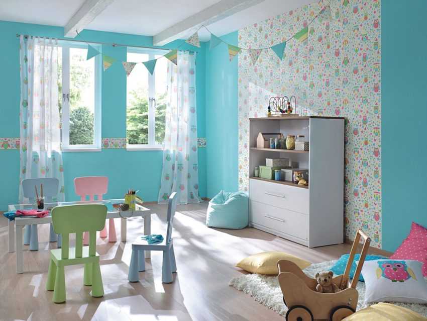 Спокойный цвет, при доминировании создает расслабляющую атмосферу в детской. Сочетается с желтым, зеленым, красным и другими яркими цветами.