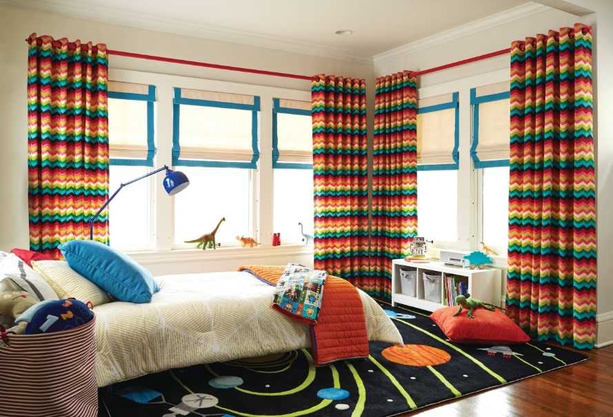 Кроме того, рекомендуется выбирать только экологически чистые материалы. Что касается цвета, то он может повторять общий дизайн спальни или быть контрастным. В основном шторы выбирают умеренно плотные, чтобы они не пропускали свет. В этом случае лучше выбрать легкий тюль, не плотный и без дополнительных деталей. Ведь пропускание света влияет на зрение ребенка при выполнении домашнего задания.