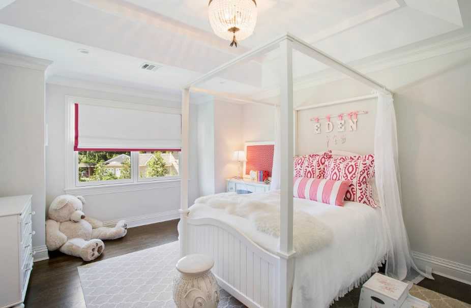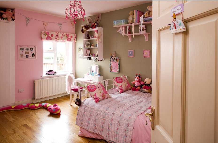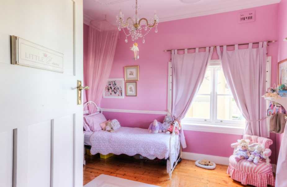 Комната девочки-дошкольника. В возрасте 3-6 лет дети посещают детский сад, где постоянно совершенствуются свои знания и умения. Контакт со сверстниками учит социальному поведению. Дети начинают иметь собственное мнение по многим вопросам, в том числе по цвету и рисунку обоев на стене в их комнате. Также существует четкое разделение на цвета и темы, неприемлемые для девочек и неприемлемые для мальчика. Многие девочки точно не согласятся на мотоциклы, автомобили, пиратов или космические корабли. Это тот момент, когда нужно украшать детскую комнату не для себя, а для маленького человека.