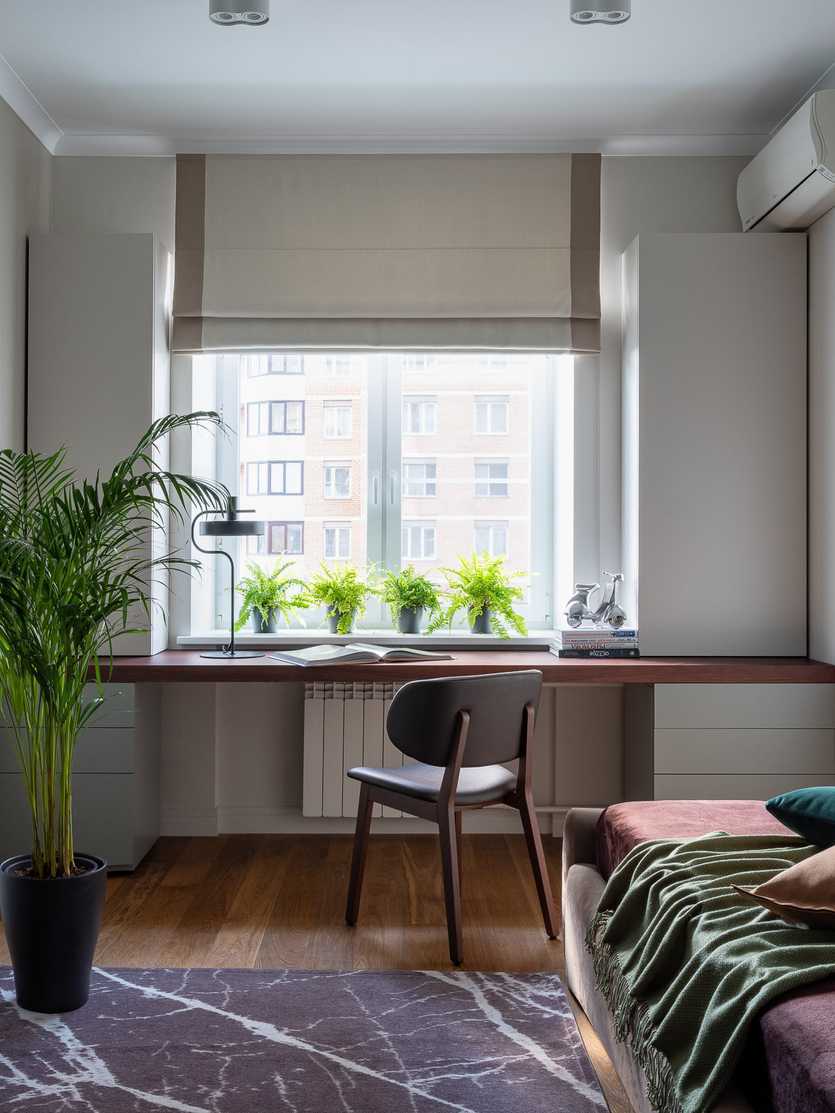 Небольшая тахта под окном станет местом отдыха, и создаст дополнительное хранилище для вещей. Подоконник можно использовать в качестве кофейного столика или полки для книг.