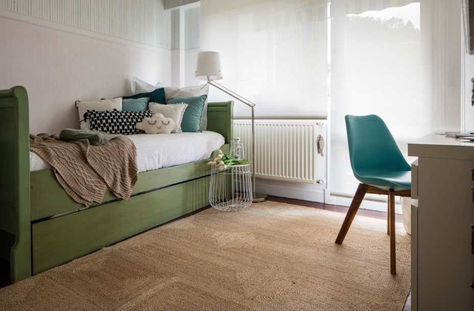 - В качестве декоров используют натуральные материалы в стиле бохо: прикроватная циновка, домотканый коврик; цветы в деревянном, вазоне; пуф с текстурой из крупной вязки. Модный предмет интерьера — стеллажи с детскими плетёными корзинами для игрушек, вещей.