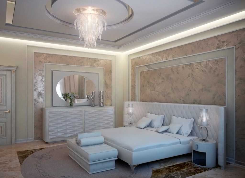 Спальня арт-деко – это насыщенное светом пространство. Предпочтение отдается мягкой подсветке с желтым оттеком. Главный светильник – большая потолочная люстра по центру комнаты. Массивная и изящная, из хрусталя или стекла, часто причудливой формы с большим количеством рожков. Еще один вариант – современная дизайнерская люстра кубической формы с текстильным плафоном. На тумбочках должны располагаться прикроватные светильники, неподалеку от туалетного столика – торшер. Красиво смотрится направленная подсветка ниш, зеркал, картин.