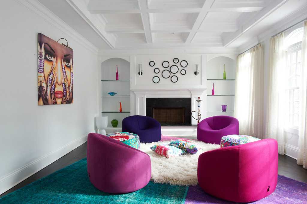 На фото интерьер, где плавные линии арт-деко в виде изысканной мебели дополнены чёрным ковром с геометрическим узором.