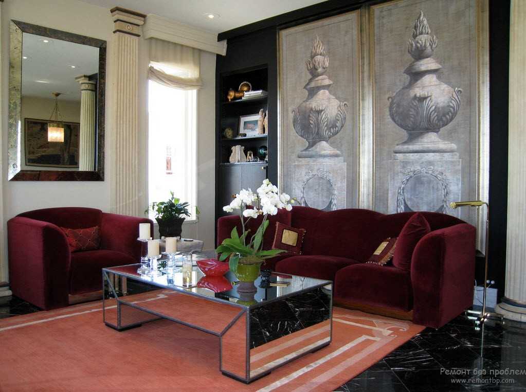 - Часто используется в барокко и бордовый. В зависимости от настроения можно взять и малиновый, цвет фуксии, темно-красный, приглушенный фиолетовый. Эти оттенки гармонируют с золотом и светлой основой – будь то белый или молочный цвет.