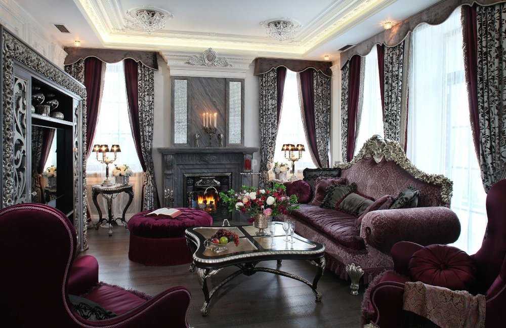 Особую роль имеет текстиль. Это не просто ткани. Шелк, атлас, бархат, парча. Многоярусные шторы из шикарного материала, которые сочетаются с мебелью или ковром. Они драпированные и даже несколько театральны.