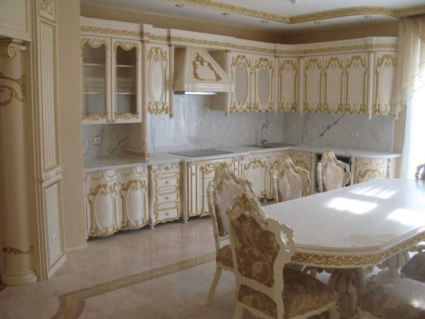 Кухня в стиле барокко обычно имеет бежевый гарнитур с золотыми декоративными элементами. Она массивная и высокая, с широкими карнизами сверху и снизу. Столешница чаще всего выбирается мраморная (белая, бежевая, карамельная, коричневая).