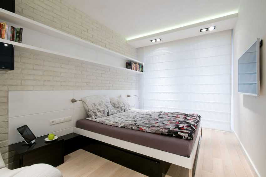 Вместо стенки устанавливают модульную систему. Для рационального использования территории подойдет встроенный шкаф-купе. Кровать выбирают без ножек, с прямоугольной основой, соприкасающейся с полом. Покрывало должно быть однотонным, без рисунка.