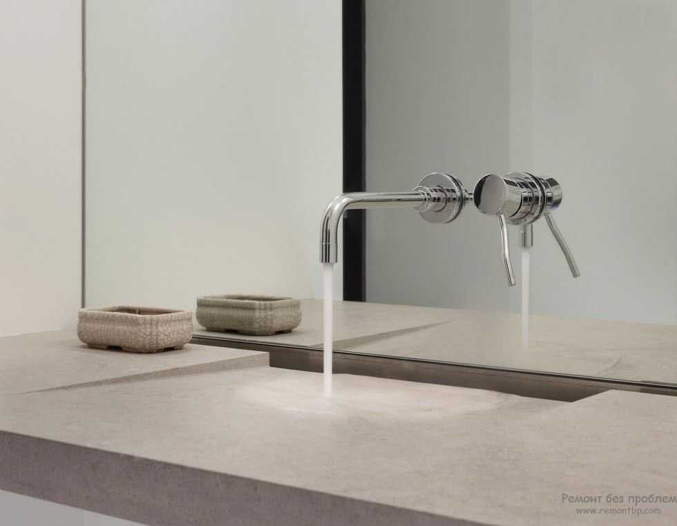 Кстати, сегодня ассортимент включает самые разнообразные смесители, как встраиваемые в стену, так и устанавливаемые прямо на раковину, низкие и высокие, а главное – запоминающейся необычной формы. И помните – краны должны иметь угловатую, строгую, и вместе с тем, изящную форму, но ни в коем случае, не закругленную. В противном случае вся гармония может быть нарушена из-за одного только крана.