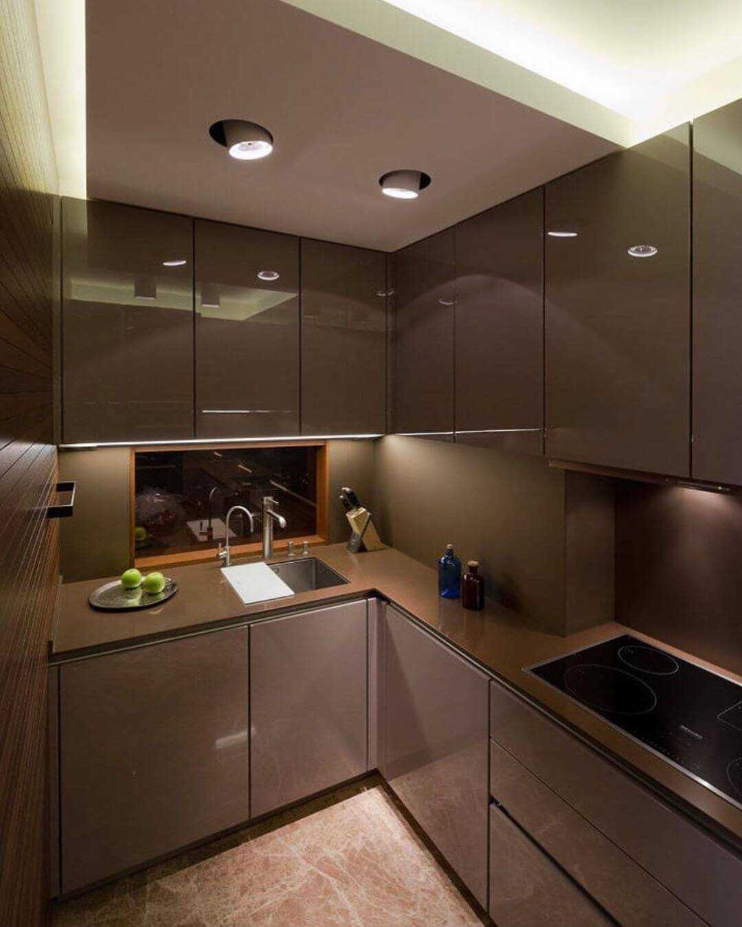 Главное в таком интерьере кухни — не дизайн светильников (они могут быть вообще незаметны!), а свет, который должен быть достаточно ярким, комфортным, проникать во все уголки.