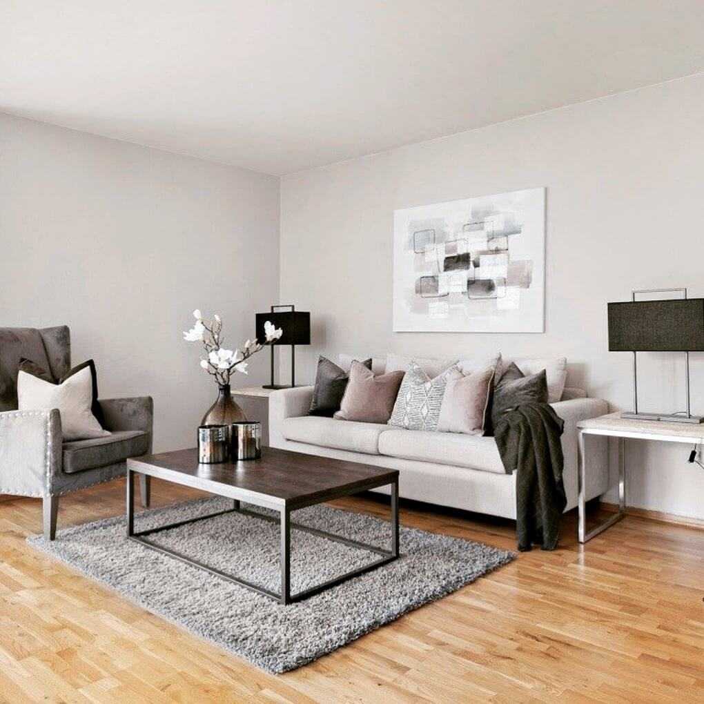 В гостиной не обязательно использовать только черно-белый цвет, отлично смотрится коричневая мебель в сочетании с основным бежевым фоном Источник roomester.ru Наполнение минималистической гостиной должно расслаблять и успокаивать, удобный серый диван и небольшой журнальный столик ‒ ничего не отвлекает внимание Источник roomester.ru