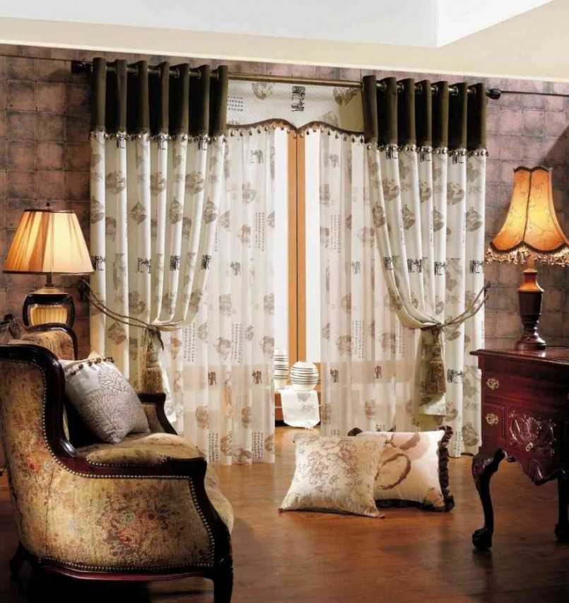 Обыкновенные занавески еще не вышли из стиля. Фото новинки 2015 предлагает приобрести массивные портьеры, весьма легкий тюль и сверху ламбрекены, которые отлично подходят к такой обстановке. Подобная композиция не пускает свет с улицы и создает удобную обстановку, а днем легко собираются по бокам окон. Такие занавески крепятся на декорированные банты.