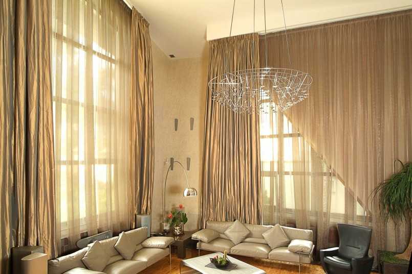 Пошив штор или подбор гардин всегда привязан к форме окон, оформлению потолка и планировке комнаты. Актуальны подвесные конструкции и натяжные потолки сложной конфигурации, за которыми скрыты карнизы или иной способ креплении штор.