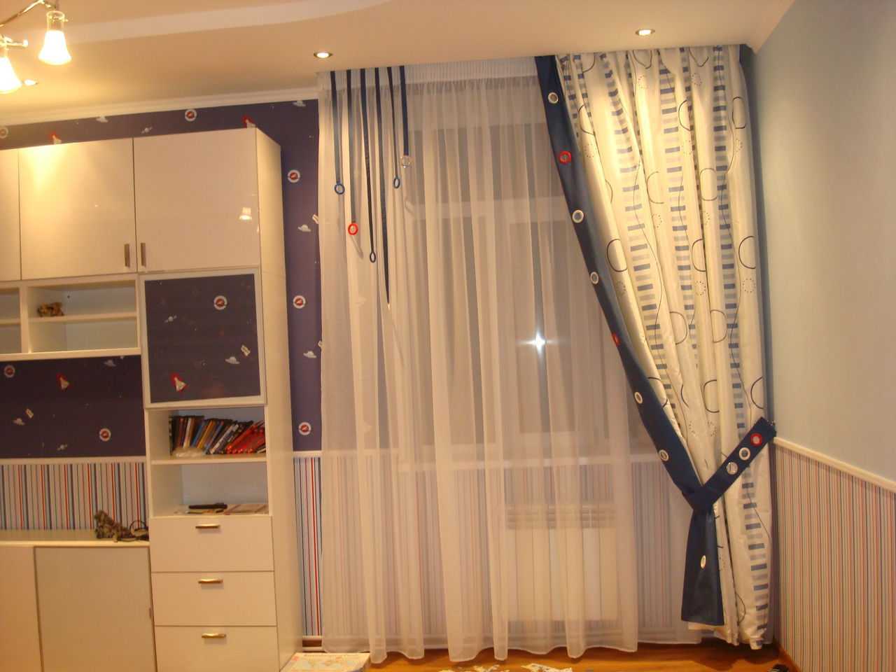 Чтобы плотно закрыть окно (при условии, что детская комната находится на солнечной стороне), выбирают лёгкие занавески и плотные портьеры в сине-белую полоску. «Матроска» поддерживает общую тематику и умиротворяюще воздействует на психику малыша.