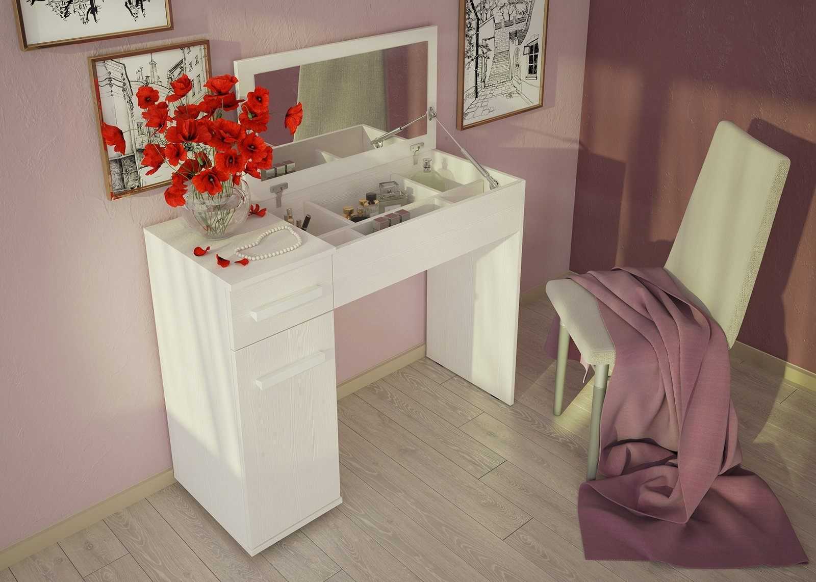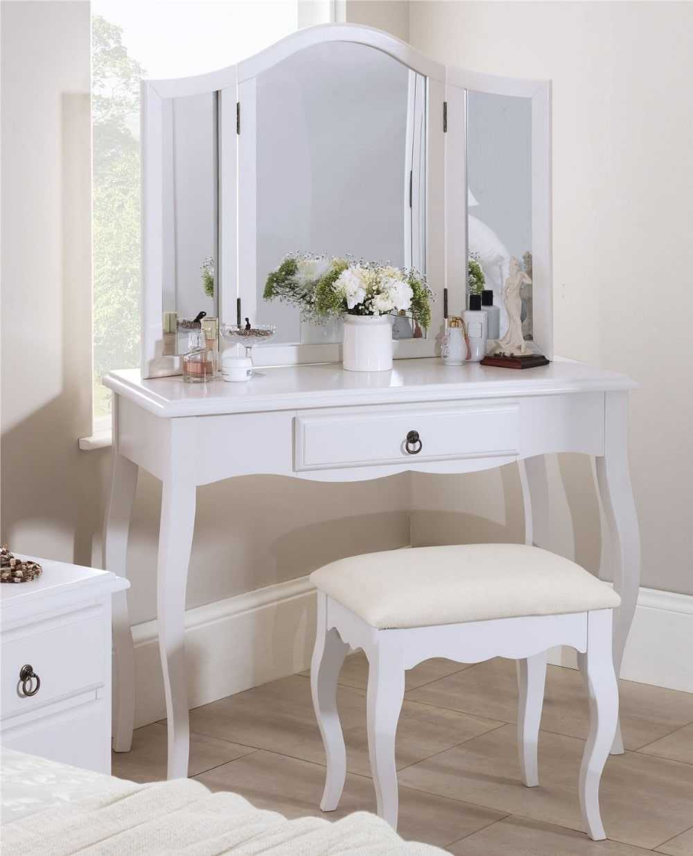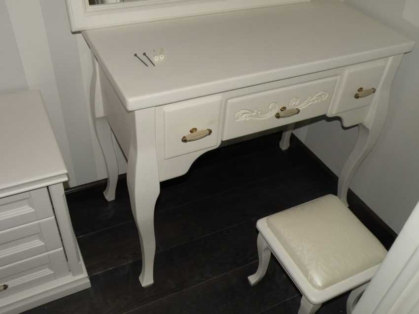 Имеет значение конструкция столика: с ящиками или без, с откидным зеркалом или стационарным, с комодом или двумя тумбами с выдвижными ящиками и так далее.