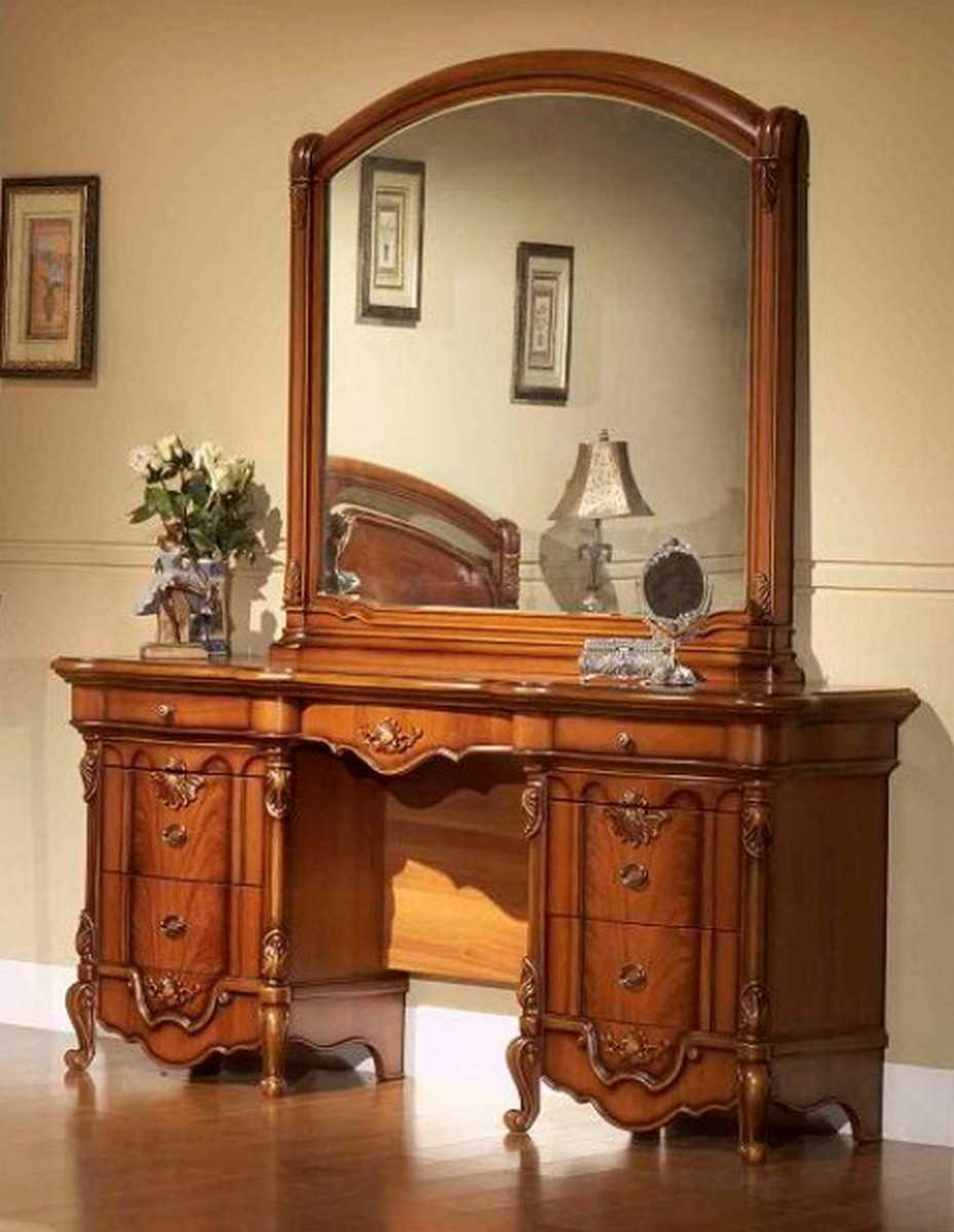 Если маленький или средних размеров туалетный столик допускает использование небольшого настольного зеркала, то крупный предмет следует оборудовать большим зеркалом. Трельяж, трюмо или настенное зеркало большого размера будет смотреться гармонично.