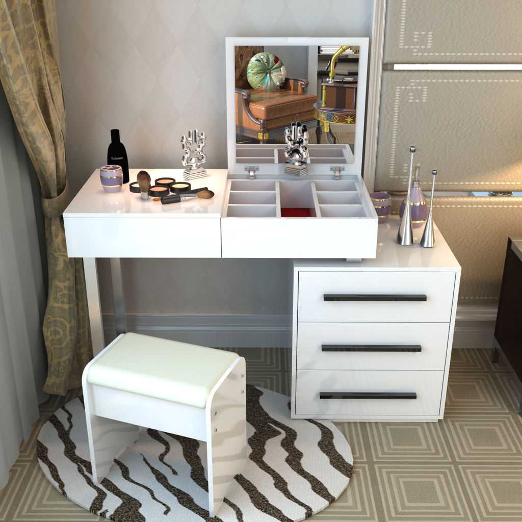 Если наличие зеркала и освещение не играет большой роли, можно выбрать туалетный столик без зеркала или с откидным зеркальным полотном. Большую площадь он не займет и будет идеальным решением для хранения туалетных принадлежностей.