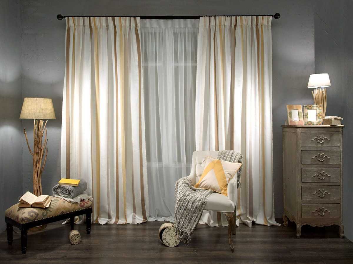 Если тюль выбирается для гостиной, чаще предполагается, что эту драпировку будут сочетать со шторами. Поэтому стоит позаботиться о создании красивой композиции.