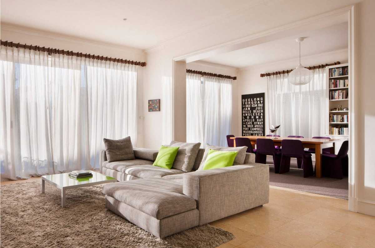 Отличный вариант для гостиной — легкие, воздушные занавески, скомбинированные с тяжелыми, плотными портьерами. Тюль в гостиной может быть абсолютно любого цвета.