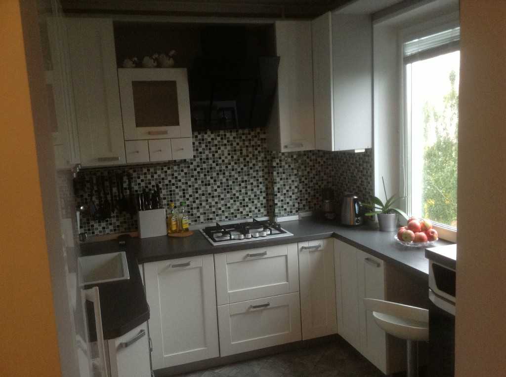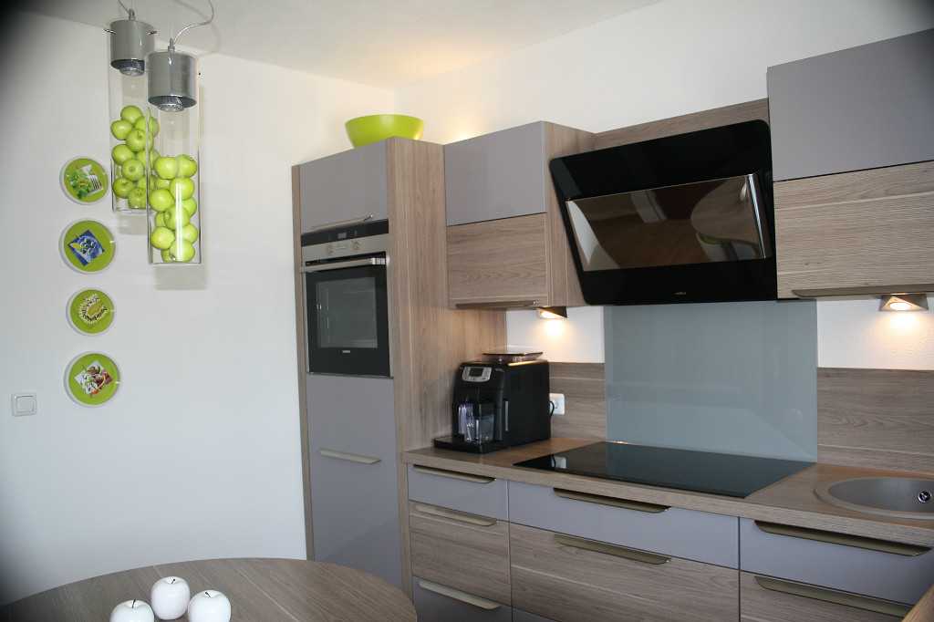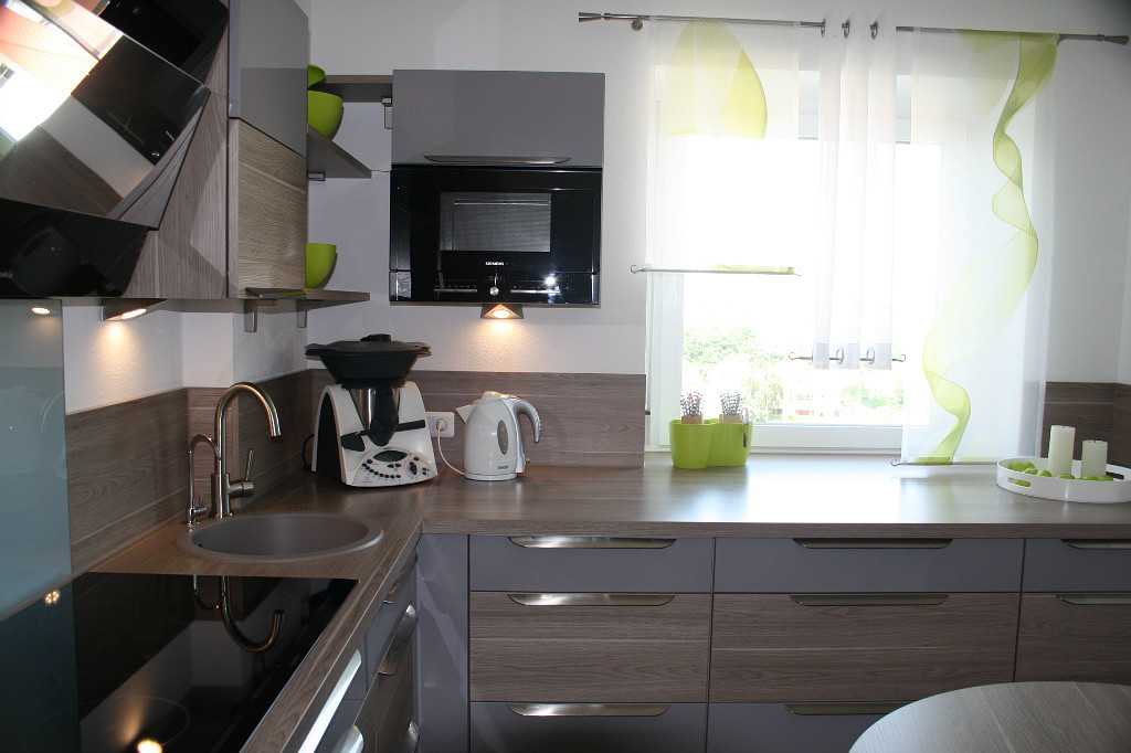 Самым удачным выбором будет серая мебель с белыми фасадами. Также интересной будет и «обратная» кухня – белая столешница с серыми фасадами. При этом дымчатый можно разбавить разводами под мрамор, крапинкой или другими комбинациями.