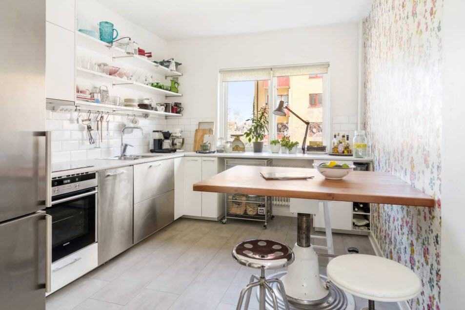 Есть вариант и со складными стульями, когда в столовой зоне стоит стол и два стула — и еще два складных висят на стене, на случай если придут гости или вся семья соберется вместе. Можно также посоветовать поставить гарнитур и вдоль стены с окном, со столешницей, но без верхних шкафов в зоне окна, что позволит увеличить полезную площадь кулинарной зоны.