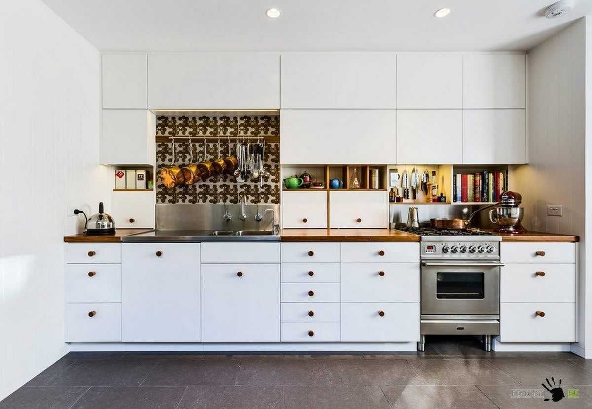 - Однорядная планировка также подходит для узких помещений, ведь таким образом, пространство не будет скрадываться за счёт рабочих зон.