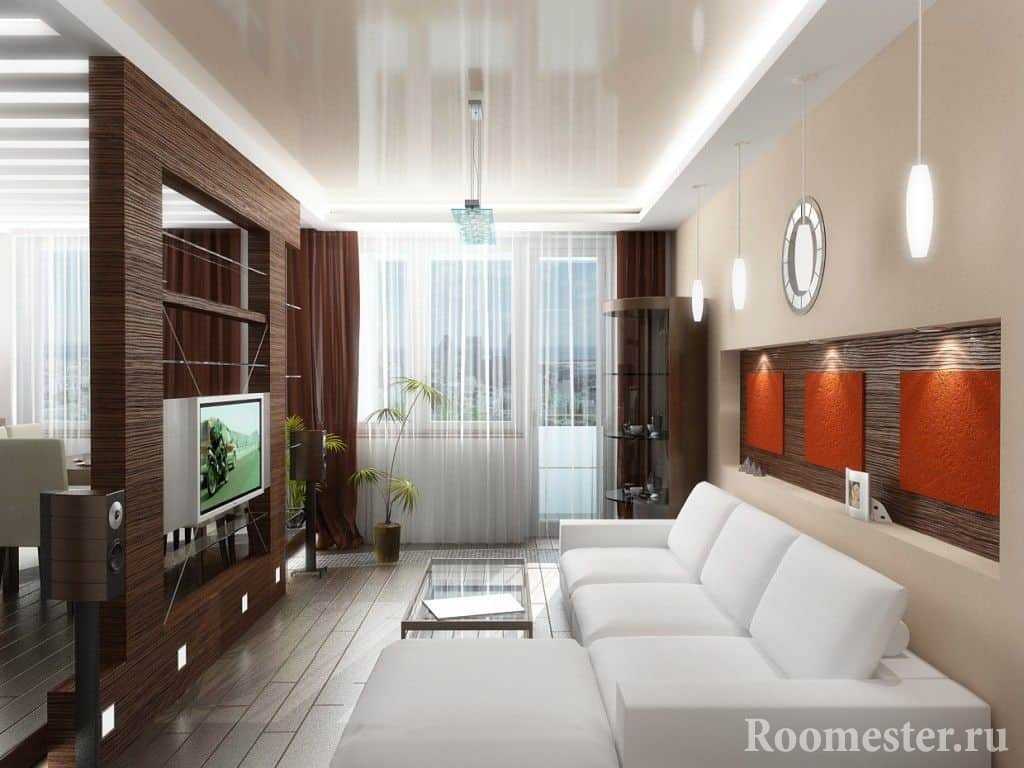 Отделка стен может быть выполнена с использованием краски, обоев, натуральной вагонки, камня. Декорируйте стены зеркалами. Оформить пол лучше качественным паркетом, ламинатом. Для кухонных стен и пола подойдет плитка. В дизайне смешанных помещений лучше прибегнуть к простому потолку, светлого цвета.