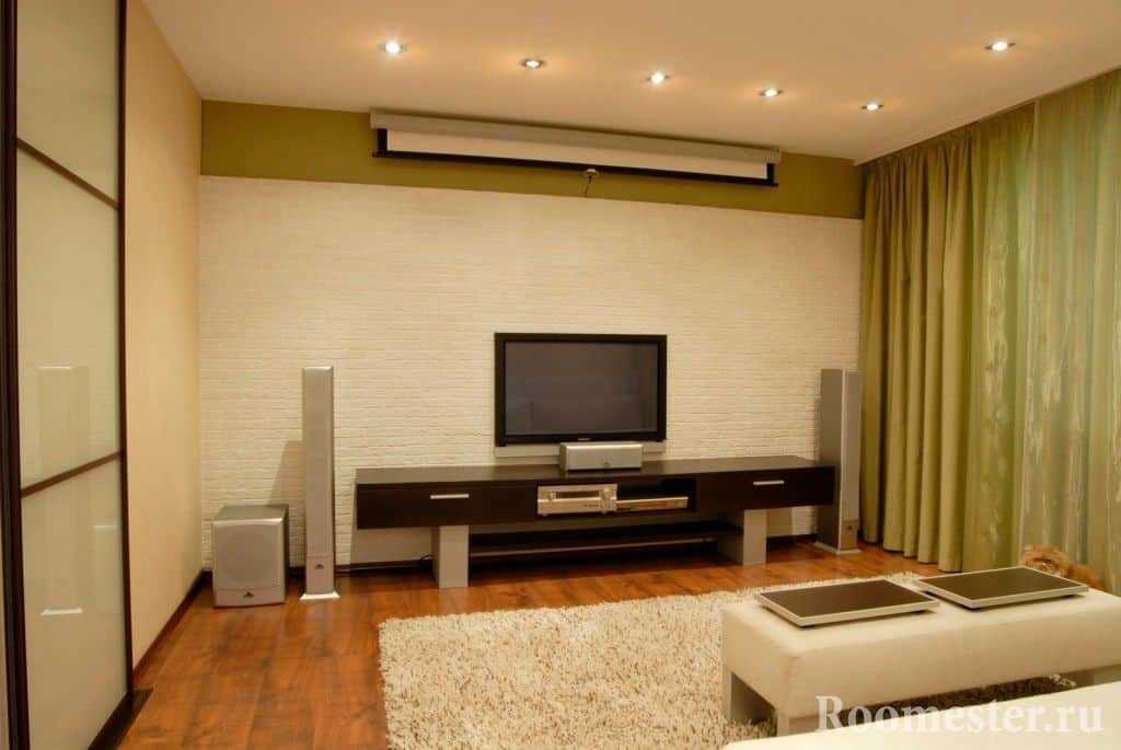 Отделка разными материалами, использование различных фактур. Например, можно сочетать штукатурку и кирпичную кладку, отделку деревянными панелям с окрашенными стенами и т.д. Будет стильно смотреться современный вариант отделки стен в зоне гостиной, например, под бетон или камень холодного оттенка, под дерево.