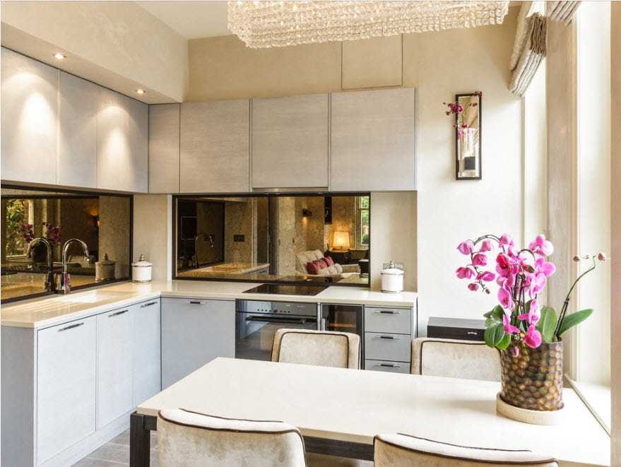 - на стене у обеденного стола можно сделать зеркальное фальшокно, что дает интересный эффект и здорово работает над расширением пространства;
