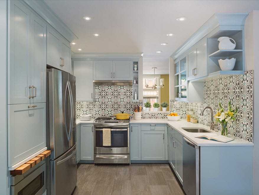 Пастельные оттенки голубого, бежевого, молочного, белого – идеальное решение для стен, потолка и пола кухни.