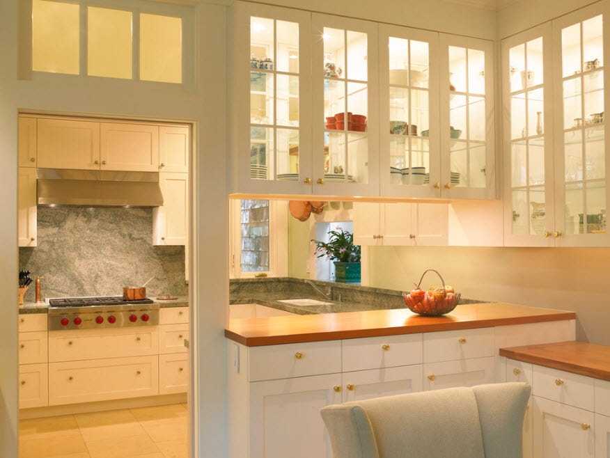 Маленькая кухня станет объемнее, благодаря освещению внутри шкафов. Подсветив прозрачные фасады и полки, можно добиться очень эффектного результата.