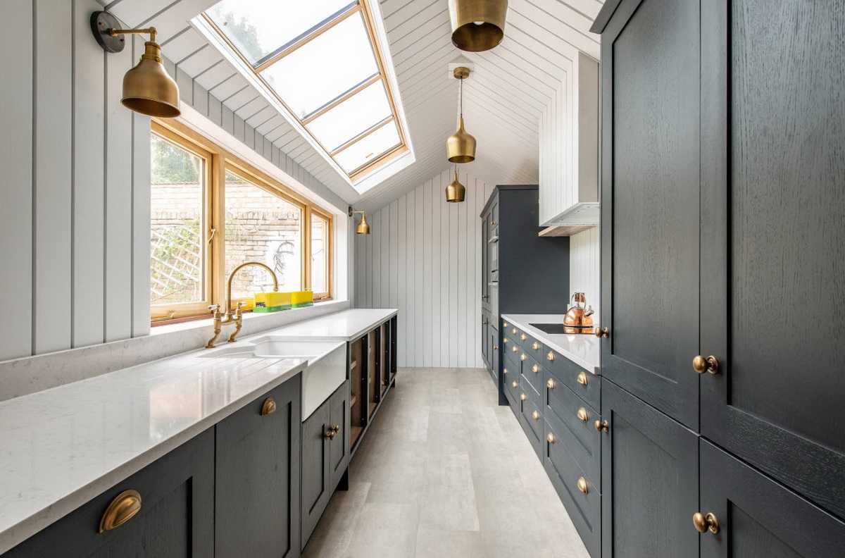 Параллельная планировка подходит для оформления прямоугольной узкой кухни. Окна на ней могут находиться как на одной стене, так и на смежных. Если на одной стене – под проемами устанавливают рабочую зону или барную стойку. Если на смежных – один проем остается свободным, можно поставить около него обеденный стол. Или расширить подоконник и сделать зону для отдыха. Такая планировка также актуальна для проходной кухни в частном доме, где есть запасной выход. Удобно, что в такой планировке подразумевается множество подвесных ящиков, можно использовать их для бытовой техники, спрятать газовый котел.