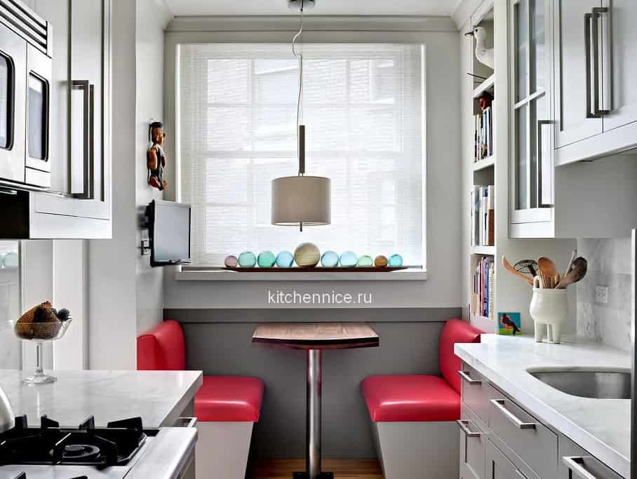 Для обеденной зоны необходимо предусмотреть мягкую уютную подсветку, которая будет освещать поверхность стола, но при этом не создавать чрезмерно яркого света. При организации освещения обеденной зоны необходимо учитывать, где она расположена. Чем ближе к окну — тем лучше. Но далеко не во всех маленьких кухнях получается расположить стол у оконного проема.