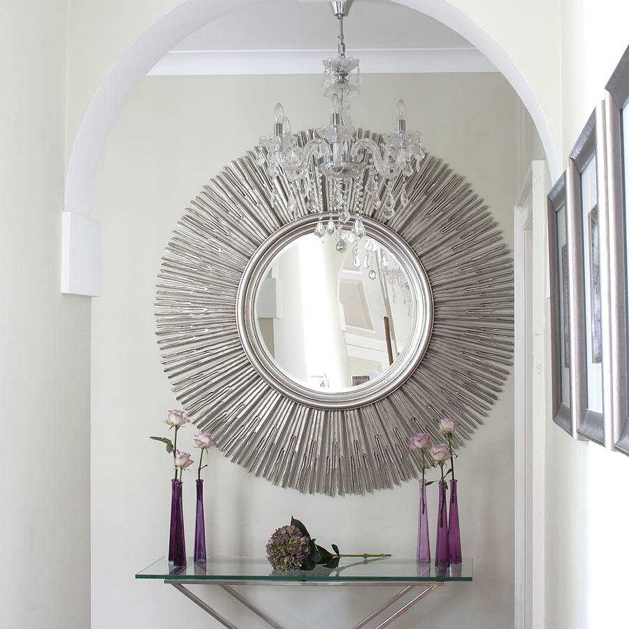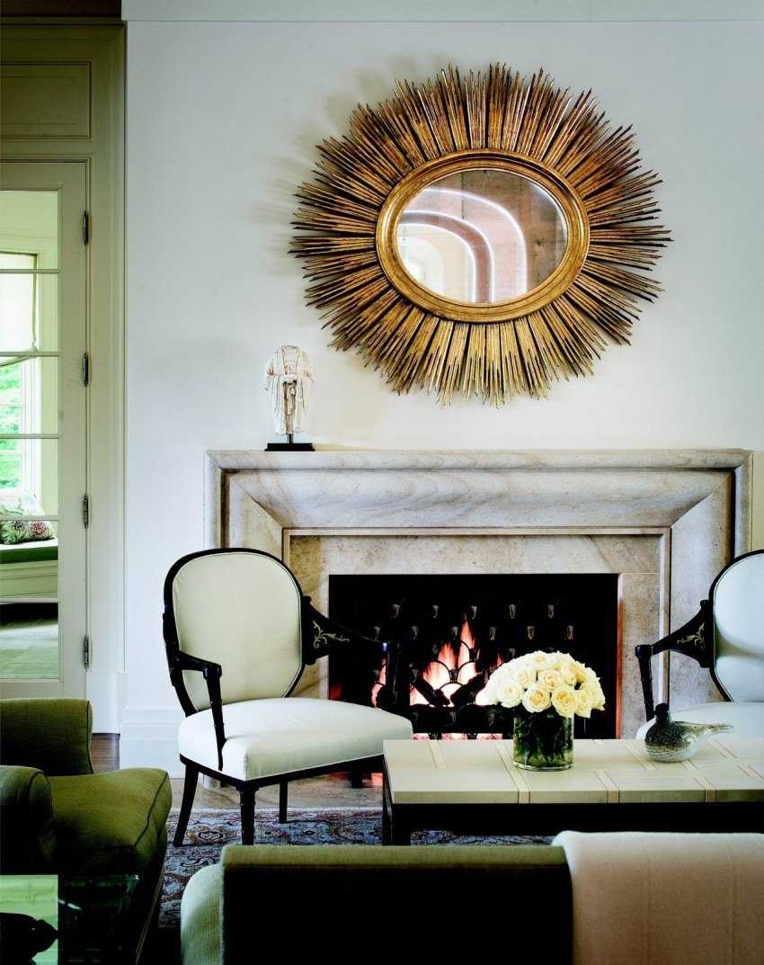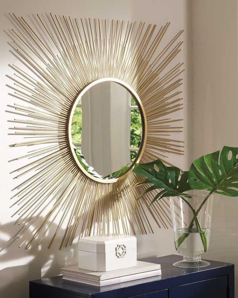 Овальные зеркала за счет обтекаемых линий привносят в интерьер гармонию и элегантность. Эффектно и необычно смотрятся модели в виде солнца с лучами разной длины. Круглые конструкции притягивают взор, позволяют создать яркий, запоминающийся акцент.