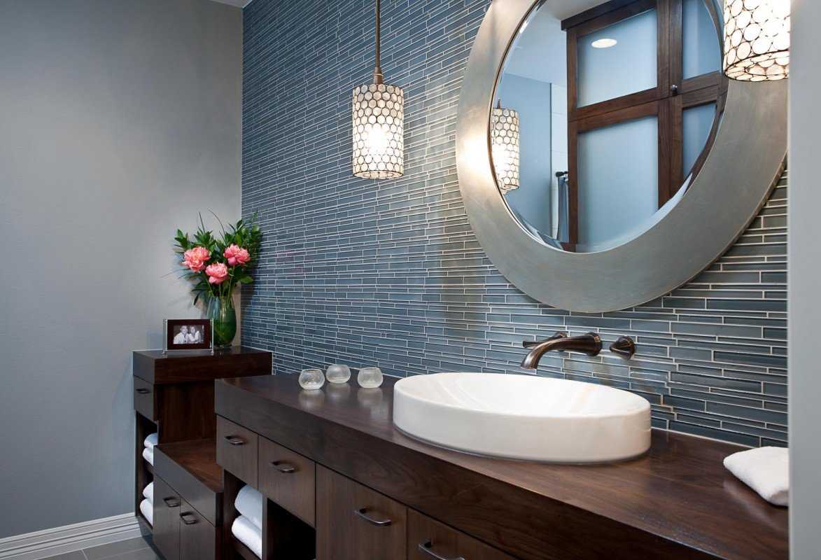 Здесь оно может быть абсолютно любым. Небольшим и округлым, большим и квадратным, зеркальной плиткой, с матовыми или цветными вставками, с подсветкой или без.